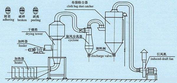 根據(jù)物料熔點、粘度等特性,可選擇合適的控制溫度、媒體粒度、材質(zhì),必要時可選擇空心粒子作為干燥媒體。根據(jù)物料特點,可選用脈沖布袋除塵器或濕式噴淋除塵器作二級除塵設(shè)備。根據(jù)用戶條件及物料所能承受溫度考慮選擇使用蒸氣、電或者熱風爐,作為熱源。